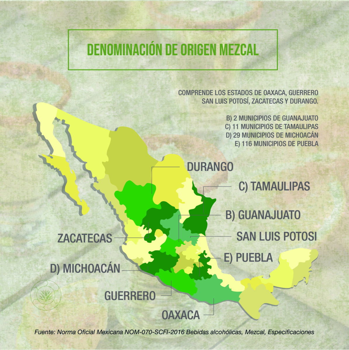 Mezcal obtained its Designation of Origin in 1994, supported by the Official Mexican Standard NOM-070-SCFI-2016. The DOM encompasses states such as Oaxaca, Guerrero, San Luis Potosí, Zacatecas, and Durango, as well as specific municipalities in Tamaulipas, Michoacán, Puebla, Aguascalientes, and Sinaloa. Mezcal is made exclusively from agaves from these designated regions, maintaining its authenticity and tradition.